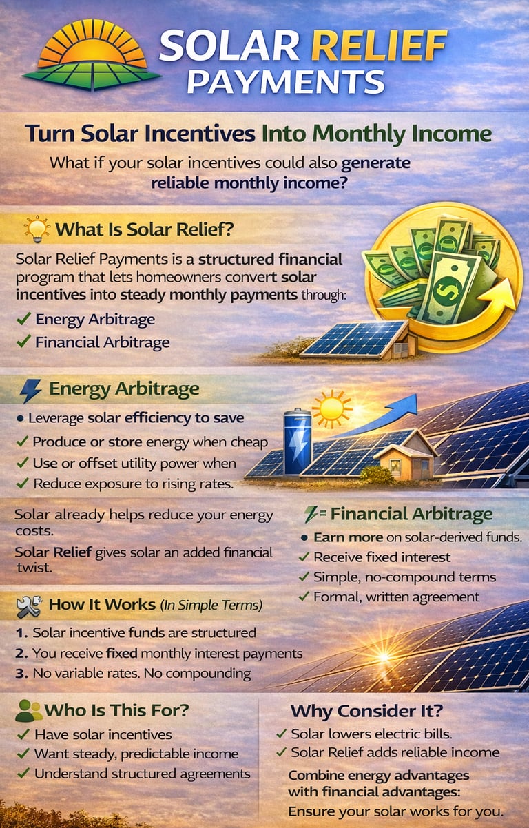Solar Relief helps homeowners convert solar-related incentive funds into predictable monthly income through a structured promissory note. The program combines energy arbitrage (using electricity price differences) and interest rate arbitrage (using capital rate spreads) to create financial efficiency. Fixed monthly payments.